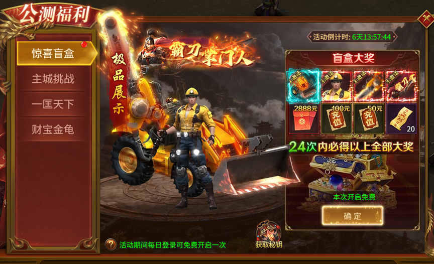 盲盒大奖总概率:27%,包含坐骑·荡平四方、时装·工程兵、武器·电锯惊魂、称号·霸刀掌门人、2888元红包、100元充值卡
