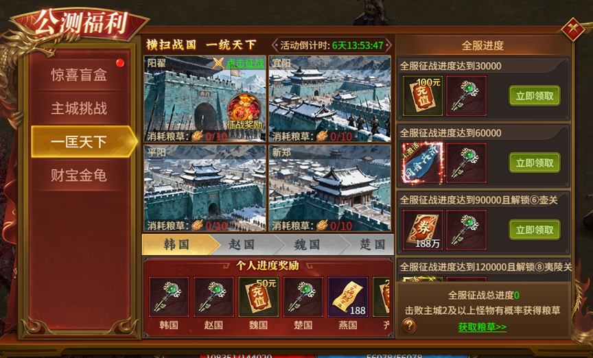当完成该战国国家全部城池征战后,可领取个人进度奖励