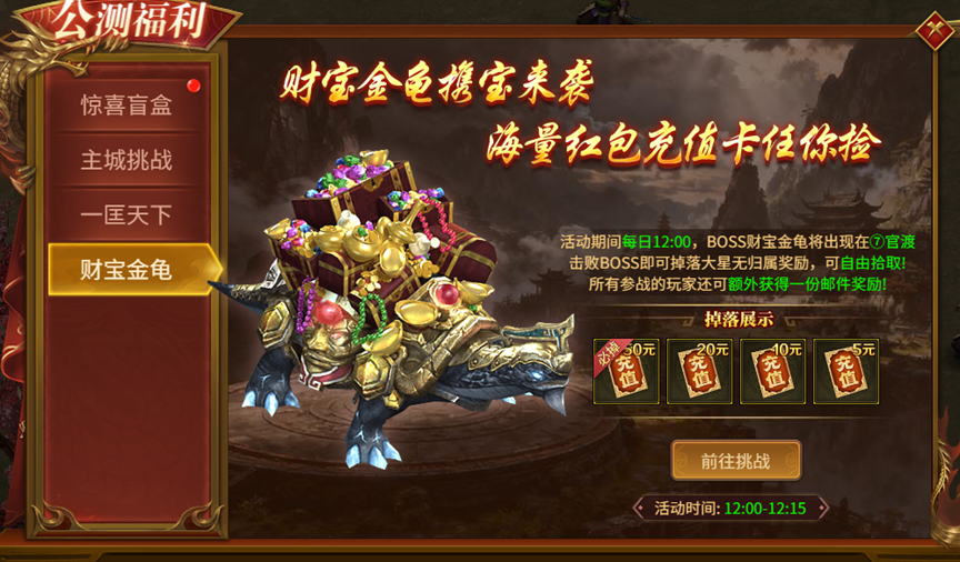活动期间每日12:00,BOSS财宝金龟将出现主城7